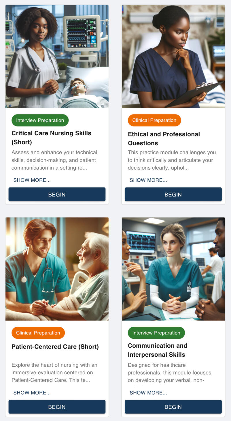 Browse and choose from a variety of modules tailored to specific nursing skills, from interview prep to clinical practice.